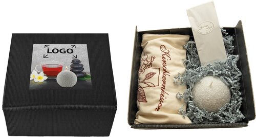 Entspannung und Wärme, das können Ihre Kunden mit unserem Winter-Wellness-Set genießen. Das Kirschkernkissen bietet eine lang anhaltende Wärme, der Tee und die Kerze Behaglichkeit. Der Natur-Baumwollstoff kann ab 100 Stück bedruckt werden. Weitere Stoff-Farben (rot, grün, blau, gelb, weiß) und andere Abmessungen sind möglich. Eine separate Karte aus unserem Sortiment oder Ihre gewünschte Beilage dienen als Werbeträger.