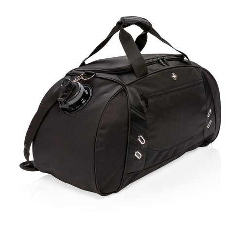 Diese 600D mit 1680D Polyester Tasche im sportlichen Design ist ideal für Ihren Besuch im Fitnessstudio oder für legeres Reisen. Inkl. geräumigem Hauptfach mit U-förmigem Reißverschluss an der Oberseite, seitlichem Schuhfach mit Belüftung und seitlichem Flaschenhalterfach. Praktisches Frontfach mit Reißverschluss für Smartphones und andere Reiseaccessoires. Verstellbarer Schulterriemen und doppelter Tragegriff an der Oberseite für besseren Tragekomfort und Trageflexibilität. PVC-frei.