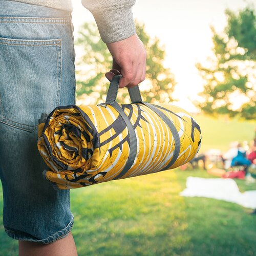 Wasserabweisende Picknickdecke, die Sie auf Ihrem Ausflug, beim Festival oder im Garten verwenden können. Die Decke hat praktische Nylongurte, mit denen Sie die Decke schnell zusammenrollen und tragen können.
