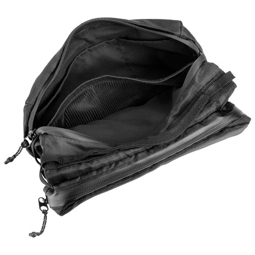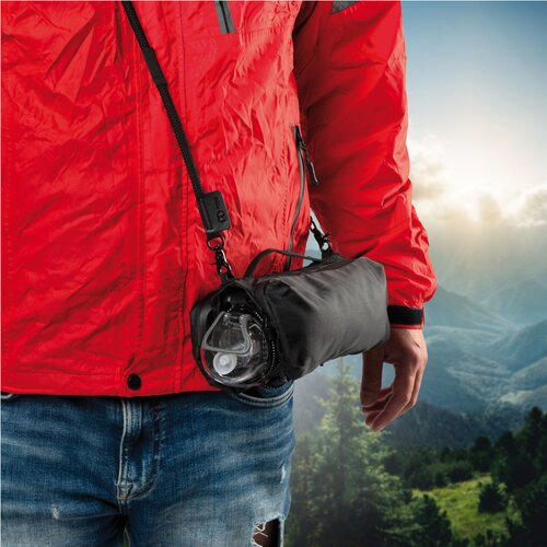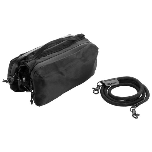 Handliche Umhängetasche von Schwarzwolf outdoor mit Platz für eine Trinkflasche oder einen Regenschirm. Die Tasche enthält zwei Haupttaschen mit Reißverschluss. In einer Tasche befinden sich zwei Taschen für Kreditkarten und eine Netztasche. In der anderen Tasche befinden sich zwei Taschen für Kopfhörer und andere Kleinteile, sowie eine Tasche mit Karabiner. Der zentrale Bereich zwischen den Haupttaschen enthält ein festes Gummi, das eine Trinkflasche oder einen Regenschirm aufnehmen kann. Verpackt in einer Papiertasche.