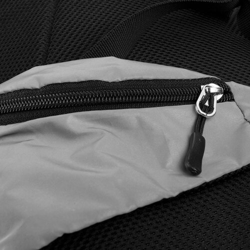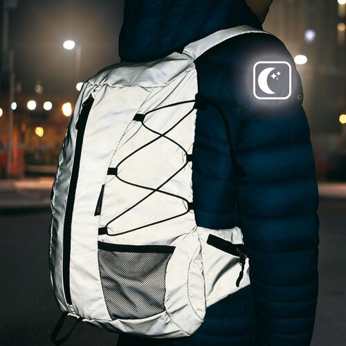 Reflektierender Rucksack für ausgezeichnete Sichtbarkeit. Bei normalem Tageslicht erscheint er grau, trifft Licht auf die Oberfläche, wird der Rucksack durch die starke Reflexion unübersehbar. Das Material erfüllt die Anforderungen der Norm EN ISO 20471 für Warnschutzkleidung. Der Rucksack hat einen gepolsterten Rücken und Schultergurte, ein Hauptfach mit Frontzugang und eine weitere kleine Reißverschlusstasche. Dazu noch eine Netztasche an der Seite, im Hüftgurt befinden sich zwei kleinere Reißverschlusstaschen.