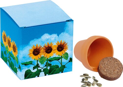 Dieser praktische Würfel enthält ein Tontöpfchen Ø 4 cm, Erdtablette, Pflanzanleitung und Samen der Zwergsonnenblume zur Anzucht der Pflanze. Standardmotiv auf sechs Seiten. Auf dem Deckel ist Platz für den Werbeeindruck ab 250 Stück. Eigene Gestaltung der Würfelpackung, 50 x 50 x 50 mm nach Ihren Wünschen ab 250 Stück.