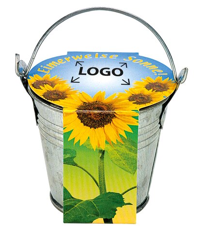 Das kleine Zinkeimerchen enthält ein Tontöpfchen, Erdtablette und Zwergsonnenblumen-Samen. Ein handliches Giveaway für Ihre wachsende Werbebotschaft. Ihre eigene Gestaltung der Banderole bereits ab 250 Stück.